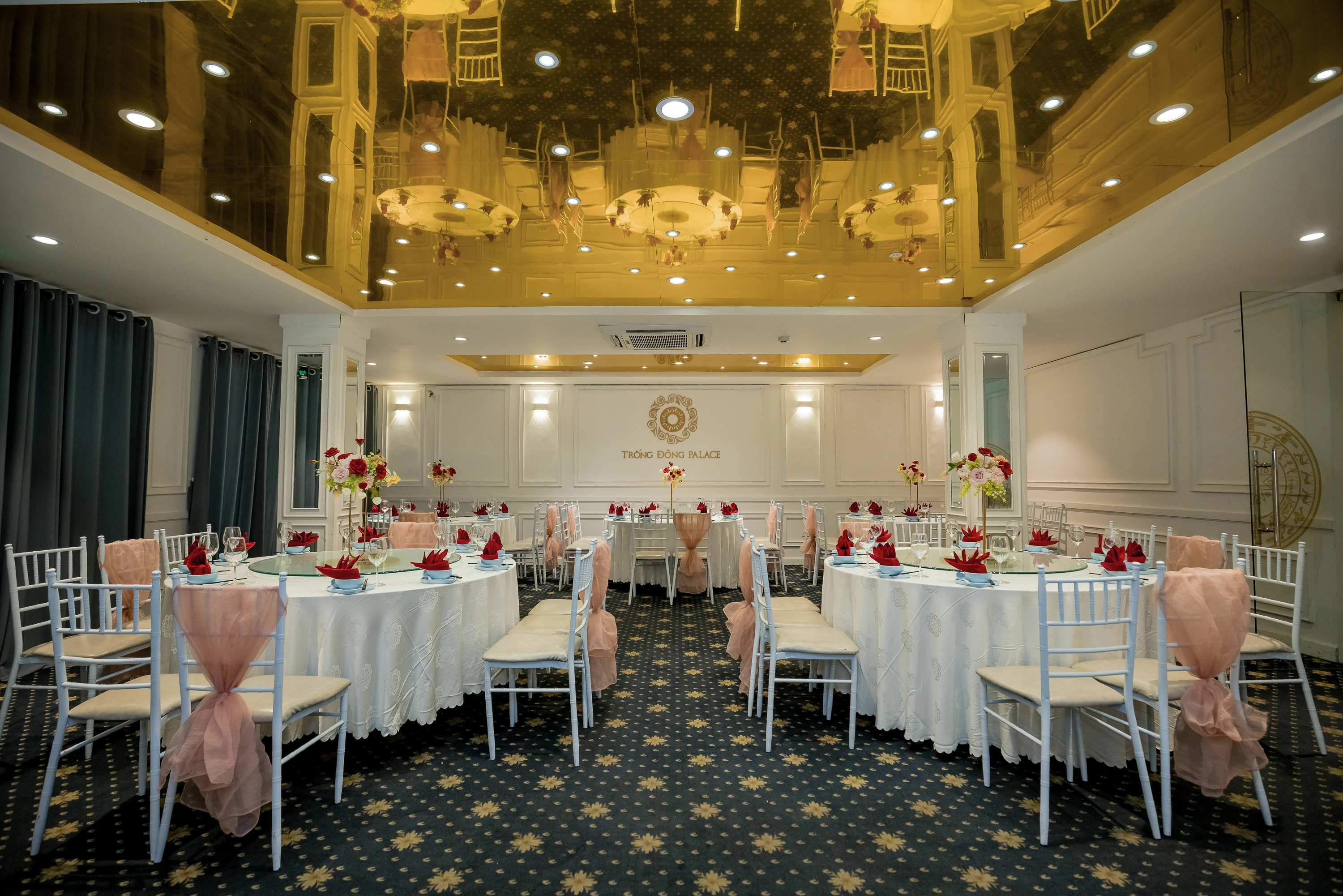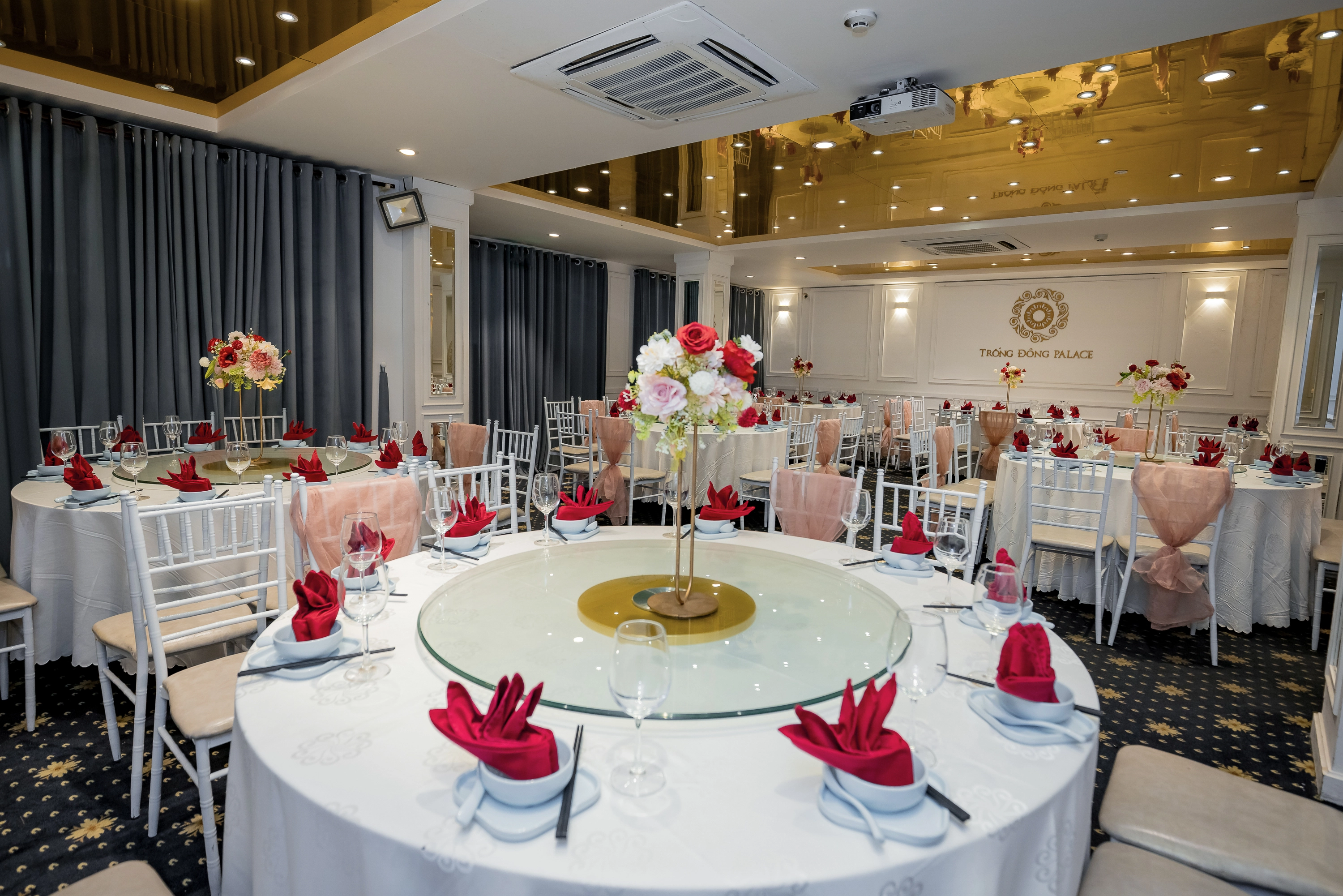 Giữa khu phố cổ nhộn nhịp của Hà Nội 36 phố phường, Trống Đồng Palace 40 Hàng Cót mang những dấu ấn rất riêng của một Hà Nội xưa, thanh lịch mà vẫn sang trọng. Điều đó được thể hiện rõ nét qua việc bài trí bàn tiệc truyền thống 6 khách/bàn của người Hà Nội.
